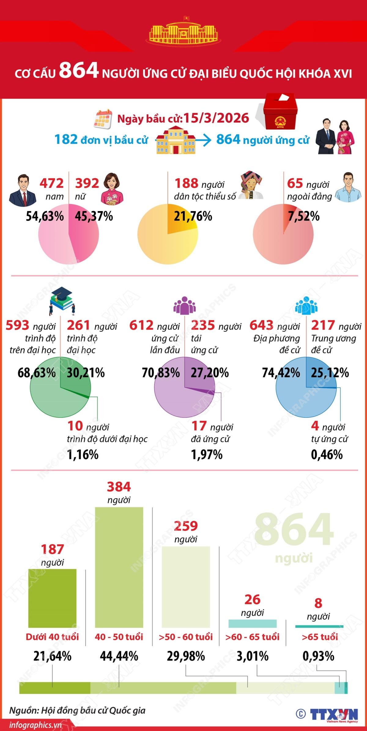 Theo đó, Hội đồng bầu cử quốc gia quyết nghị công bố danh sách 864 người ứng cử đại biểu Quốc hội khóa XVI tại 182 đơn vị bầu cử trong cả nước để bầu 500 đại biểu Quốc hội khóa XVI. Trong số 864 người, có 392 người là nữ, chiếm 45,37%; 188 người dân tộc thiểu